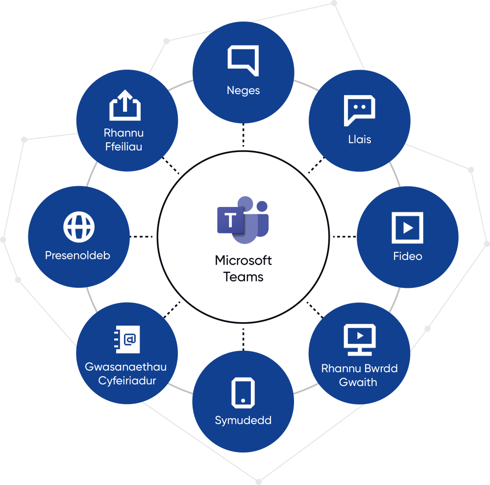 Gall sefydliadau Sector Cyhoeddus Cymru nawr ddefnyddio Microsoft Teams i ysgogi mwy o gydweithio o fewn a rhwng adrannau a sefydliadau. Cyfunwch nodweddion cydweithredu gwych Teams â nodweddion teleffoni menter uwch, galluoedd canolfannau cyswllt, cymorth a dibynadwyedd Cysylltu Cymru.