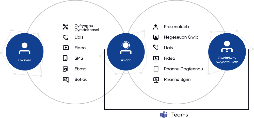 Yn mynd â Microsoft Teams y tu hwnt i gydweithio rhwng gweithwyr mewnol, drwy integreiddio Teams i’r ganolfan gyswllt. Mae ein cyfleuster aml-sianel Cysylltu Cymru yn rhoi mynediad i’ch dinasyddion at asiantau eich canolfannau cyswllt drwy sianel o’u dewis; yna mae gofod gwaith a rennir Microsoft Teams yn galluogi eich asiant i ymgysylltu’n ddidrafferth ag arbenigwyr y swyddfa gefn i ddarparu’r datrysiad gorau ar gyfer pob cyswllt gan ddinesydd.